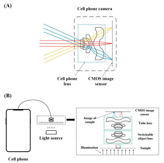 Principle of a miniature cell phone microscope. (A) Under normal circumstances, the cell phone lens can image a large field of view on a highly flat CMOS image sensor. This means that according to the principle of reversibility of light paths, high-quality microscopic imaging can be carried out when the cell phone lens is reversed. (B) Switchable reversed cell phone lenses are used as switchable objectives. They couple light from the sample through the tube lens and form the image of the sample on the CMOS image sensor. At last, the cell phone will process and display microscopic images. The microscope module is outside of the cell phone.