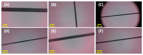Photos of 100 μm wide line target obtained by the tube lens (EFL = 6 mm) matched with different cell phone camera lenses. (A–F) The pictures correspond to different object lenses in turn, which are LG G5 super wide-angle lens, P20pro wide-angle lens, P20pro tele-photo lens, P20pro standard lens, Mate20 wide-angle lens and Mate20 standard lens.
