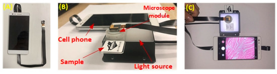 Fabricated miniature cell phone microscope. (A) After modification, the cell phone camera can be led out of the cell phone by a flexible cable. (B,C) Image of the miniature microscope configuration and working scene.