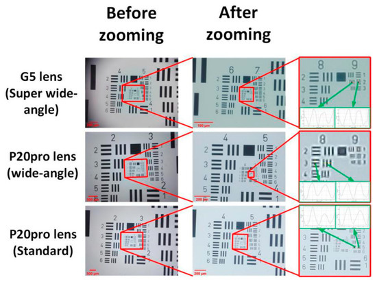 The imaging test results of the six dismantled lenses are shown in Figure 3. The magnification ratio can be determined according to the line width (in pixels) in the image, the pixel size on the sensor and the nominal line width of the sample. The focal length of the dismantled lenses can be calculated based on Equation (1). As shown in Table 1, by selecting different lens modules, we can realize the switching range of magnification of ~3.9×. In the following experiments, we selected three lenses as the objectives in the miniature microscope, namely LG G5 super wide-angle lens (FL = 1.5 mm), Huawei P20pro standard lens (FL = 6 mm) and P20pro wide-angle lens (FL = 4 mm). The larger focal length lens (Huawei P20pro tele-photo) was not selected for aperture mismatch reasons, which will be discussed in the following part.