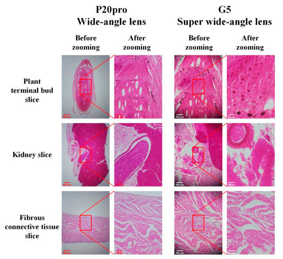 Imaging tests of real biological samples. Sample images of a plant terminal bud slice, a kidney slice and a fibrous connective tissue slice are obtained with the built microscope using the P20pro wide-angle lens and the LG G5 Super wide-angle lens as objectives. We also used the zoom function in the imaging process.