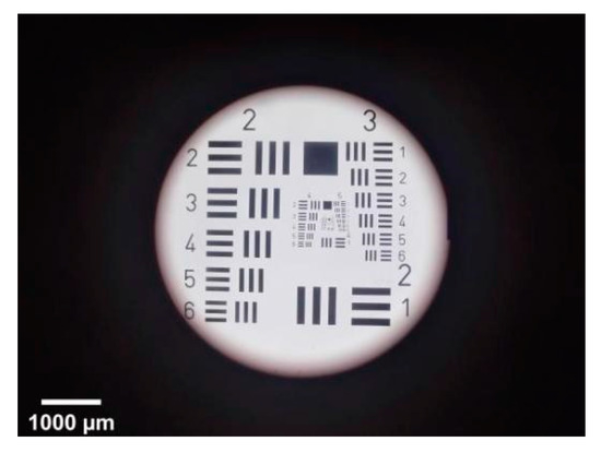Picture of resolution test chart using P20pro tele-photo lens (EFL = 8 mm). Theoretically, when the longer focal length lens is used as an objective lens, the magnification will be reduced and the FOV will become larger. In practice, the FOV may be limited to a smaller circle by the objective lens imaging angle limitation.