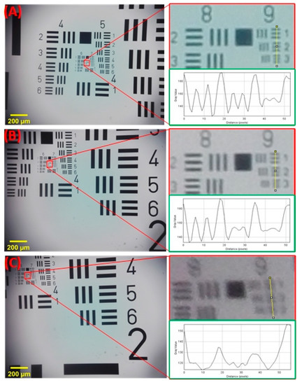 According to the concept of the switchable object lens, we purchased a series of off-the-shelf cell phone camera modules and disassembled them to obtain a series of lenses with different focal lengths (Figure 2A). As accurate camera lens information is not easy to obtain, we firstly measured the focal lengths of lenses, as shown in Figure 2B. The fixed tube lens module is composed of a camera module (Figure 2C) with a known focal length (EFL = 6 mm) and a Sony IMX258 sensor (pixel size = 1.12 μm). The object lenses are connected with the module to image a 100 μm wide line target (Edmund Optics). In this process, we designed an experimental system for precise adjustment of the working distance, building it with a 3D printer (Figure 2D). As for illumination, we utilized a simple LED diffuse backlight in the transmission approach. The results of the imaging test are presented in Figure 3.