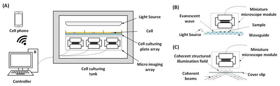 Potential applications based on the proposed miniature microscope. (A) Real-time microscopic wireless observation of the enclosed cell culturing process. (B) Scheme of a low-cost total internal reflection miniature microscope. (C) Scheme of a low-cost structured illumination miniature microscope for enhanced resolution.