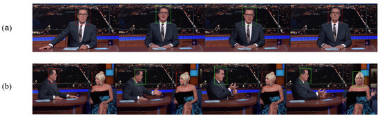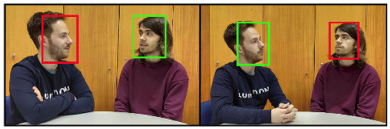 Active speaker detection (ASD), or the ability to recognize who in a group is speaking at any given time, is a subset of human activity–passivity recognition. This subset focuses on mapping utterances that make up a speech signal, such as in a conversation, to either a closed or open set of intervening speakers. In turn, techniques from the subset may take advantage of audio-only, visual-only or audiovisual information depending on their nature. Though studies do exist taking advantage of other types of perceptual input, such as [3], these are far more uncommon and somewhat less successful. In the past, extensive research effort has been put towards the audio-only section of ASD as a side tool for other problems [4,5]. Techniques generally relying on sequential speaker clustering [6] or speech source localization [7,8], were often enough to achieve real-time diarization, some occasionally aided by supervised learning. Unfortunately these were constrained by predetermined assumptions—mic location, static speakers, controlled environment. Furthermore, audio-only approaches remain unable to match segmented and clustered speech with visual speakers without additional data or restrictions, limiting their use on audiovisual data. Hence, visual approaches to the topic become useful, though not without their own drawbacks. Unreservedly interpreting lip movement [9], or other facial feature variations [10,11], as vocal activity without accounting for similar motions stemming from normal human interaction—emotional expression, coughing, chewing—will of course negatively impact the detection process. An exemplary output of an active speaker detection system is shown in Figure 1, for easier understanding.