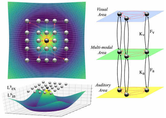 Considering a neural area , pertaining to the auditory a, visual v and multi-modal m factors. Asserting s to be composed of neurons as previously described, each neuron or receives a composite input , which is described by Equation (1). Here and k denote iterators over as such: .