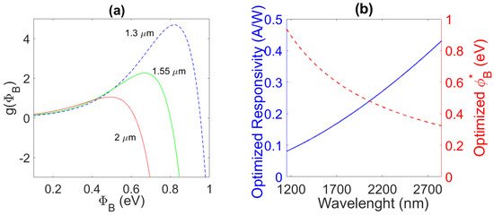 (a) Behavior of at 300 K for three wavelengths: 1.3 μm, 1.55 μm, and 2 μm; (b) optimized responsivity R (blue solid line) and optimized Schottky barrier height (SBH) (red dashed line) as a function of the wavelengths.