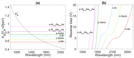 Figure 3a shows the intersections between these values of SBH for different semiconductors and the curve of the optimized at room temperature (given by Equation (14)), suggesting the working wavelength to achieve the highest ratio for each material. In the range of wavelengths where > , the SBH can be lowered down to its optimal value as in Equation (14) by simply applying a specific reverse bias to the junction.