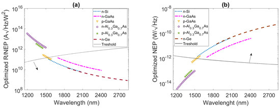(a) The optimized and (b) the optimized of the Schottky graphene-based PDs for various semiconductors as function of the wavelength range individuated in Table 3. All figures were obtained at room temperature and by considering a graphene circular area in touch with the semiconductor with radius of 500 μm and a load resistance of 10 M. The arrows indicate the validity regions of the proposed optimization procedure.