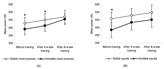 Maximal values of mean power during (a) chest presses and (b) squats before and after 4-week training under stable and unstable conditions.