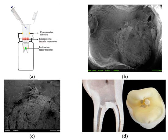 (a): Illustration of the experimental model. (b,c): SEM images displaying bacterial penetration at the perforation site. Clinical and X-ray of lower molar after perforation repair (d).