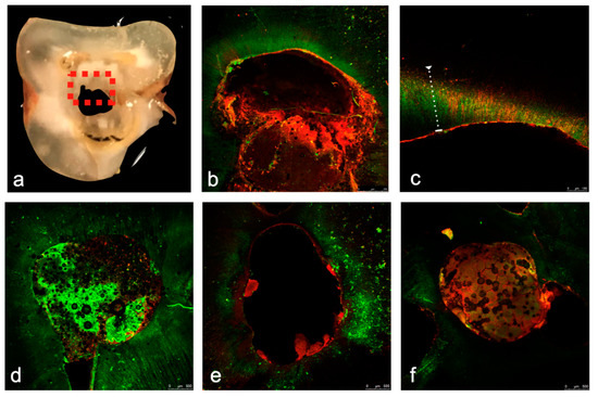(a–f). Confocal laser scanning microscopy (CLSM) images. The specimens were cut through the perforation site containing the repair materials perpendicularly to the long axis of the root in order to be evaluated by the CLSM. The perforation site can be clearly seen, and the dotted square represents a single evaluated area (a). Prior to scanning, LIVE/DEAD Kit stained the infected dentin. Vital (Green) and dead (Red) bacteria inside the dentinal tubules in the evaluated areas are clearly visible (b–f). Positive control (b,c), MTA-Angelus (d), Endocem (e) and Biodentine (f) groups showing fluorescence staining. Significantly more dead bacteria (Red Staining) than live bacteria (Green Bacteria) were detected on the dentinal surface at the circumference of the perforation defect (d–f), and significantly more live (Green Staining) bacteria than dead bacteria down in the dentin inside the dentinal tubules (b–f) were detected in all groups.