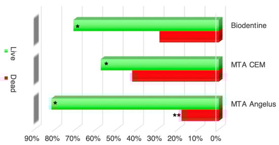 The average percentages of live (Green) and dead bacteria (Red). The average bacterial contamination (stained areas) of live and dead bacteria in all locations tested combined (buccal, lingual, mesial, and distal). * Significantly more live bacteria were seen in Groups 1–3. ** The ratio of live to dead bacteria was significantly higher in the MTA-Angelus group (Group 1) than in the other groups (p = 0.001).