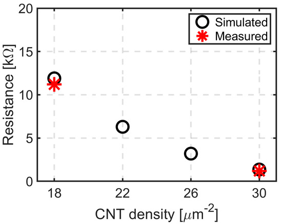 Simulated and measured resistance of a 3 × 3 mm2 spray coated CNT network. Data extracted from [49]. Simulation results are obtained by means of the resistive 3D network model described in the cited work.
