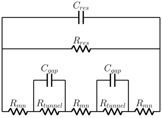 Each percolation path identified across two sides of the simulated box volume introduces a parallel branch, accounting for the material changing its behavior from insulating to conducting. Each branch includes a series of a resistor and an RC parallel. The series resistance is the CNT resistance Rmn given by Equation (11); the RC parallel includes the tunneling resistance, Rtunnel, of Equation (12) and the capacitance originating from the gap between two neighbor CNTs filled with the dielectric polymer, Cgap, of Equation (17). The schematic view of the equivalent electrical 3D network is shown in Figure 6. The equivalent electric impedance can be used to compute the overall frequency-dependent equivalent electrical conductivity by knowing the investigated volume dimensions along the three axes. The authors confirmed the consistency of the simulation results by comparing the simulated electrical percolation threshold with that reported in several other works in the literature.