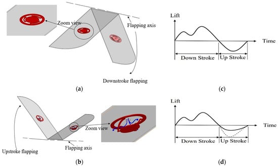 Observed from the downstroke and upstroke motions of a full flapping cycle, most of the researchers performed lift enhancement during the downstroke period. There are several ways for lift improvement; for instance, by increasing the wing foil thickness and the camber [], by adding wing corrugation [], by enlarging the stroke angle [], using wing rotation mechanisms [], using morphing wings [,,], by changing the wing materials [,,], or by adjusting the wing stiffness along the chord-wise/span-wise direction []. Not many studies have been performed for the enhancement of lift through mimicking feathers [,,,,,,] in the upstroke. The adaptive flight control of Caltech’s Microbat by using check valves [], the Festo’s BionicSwift using of aerodynamic feathers similar to overlapping shingles on the roof [,], and the ventilated design [] are the prominent research works in lift enhancement. Compared to the Caltech’s Mircobat, the wingspan and body mass of Festo’s Bionic Swift and the ventilated design [,] is much larger. Based on the more familiar understanding of the 20 cm-span FWMAVs [,,], herein we would like to qualitatively address the validity of the lift enhancement mechanism in Figure 1.