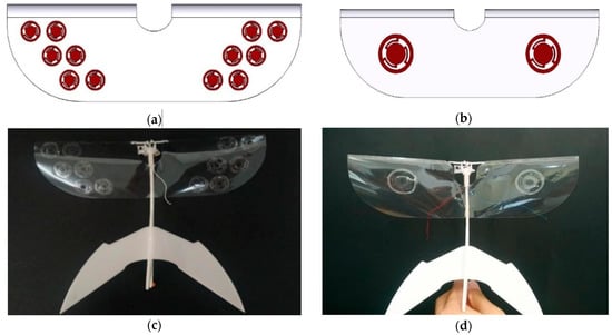 FWMAVs with PET wings made by a cutting plotter Graphtec CE5000-60: (a) 12 check-valve drawing; (b) 2 check-valve drawing; (c) multiple (×12) check-valves with disc-cap radius of 4.95 mm; (d) single-pair of check-valves with disc-cap radius of 7.43 mm on a wing.