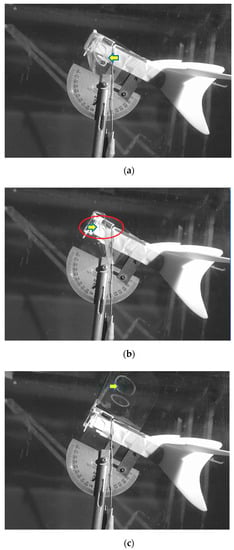In order to visualize the motion of the check-valves, an infallible method of identification was performed by using a high-speed camera with the capability to capture images at 1000 frames per second. The flapping wing is activated using a DC motor, which is connected to a power supply unit. Figure 5a shows the valve opening at the beginning of the upstroke flapping motion and confirms the functional aspects of the designed check-valve. Figure 5b shows that the central disc-cap deforms (7.39 mm) far away from the hole. Lastly, when the wing starts moving in a downstroke motion, the check-valve is closed, as shown in Figure 5c.