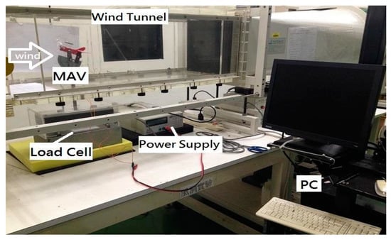 As the result of natural frequency, wind tunnel experiments can provide tangible proof of the efficiency of valves; however, more evidence is needed to validate the hypothesis about the effectiveness of the check-valve. Though the result of frequency is satisfied, it is difficult to quantify the contribution in enhancing the lift by incorporating the check-valve. The wind tunnel experiment, to measure the lift and net thrust, can be a useful indicator with respect to flapping motion characteristics. The wind tunnel, shown in Figure 6, has a contraction ratio of 6.25 with a test section of 30 cm × 30 cm × 100 cm [,,,,]. The wind tunnel experiment was conducted for the two cases with and without check-valves of FWMAV. The following are the testing conditions considered for the present study: