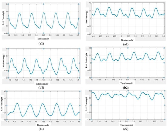- It is evident from the lift waveform that the lift during upstroke presents a positive small value, rather than a negative small value, as shown in Figure 7(a2,b2,c2).