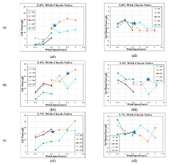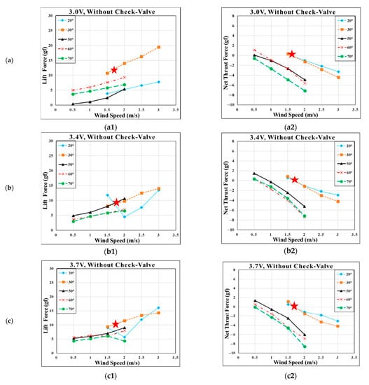 The lift data, measured for these two cases with and without check valves, are depicted in Figure 7. The lift waveforms correspond to the flapping wing at an inclined angle of 30° for a 3.7 V driving voltage. It is observed from these plots that the original negative lift parts, shown in Figure 7(a1,b1,c1), are shifted positively, shown in Figure 7(a2,b2,c2), using the check-valve action, which is similar to the lift enhancement principle alluded to in the expected lift waveforms shown in Figure 1. The wind tunnel data are processed in MATLAB software using an LPF (low pass filter) with a noise cut-off frequency of 30 Hz. However, only one set of lift waveforms in Figure 7 is not sufficient to evaluate the overall lift enhancement of the check-valve action. We collected full data of lift and net thrust, according to different testing conditions, and obtained their average values. Figure 8 (without check-valve) and Figure 9 (with check-valve) are plotted by considering the time-average of more than 100 flapping cycles for each data point [,].