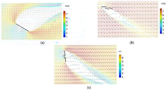 Finally, we identified that, for the case of (3.0 V-30°-1.6 m/s), the check-valve case generates 14 gf lift, which is 27% higher than the 11gf lift of the membrane wing without a check-valve. In addition, for the case of (3.7 V-30°-1.5~1.75 m/s), the check-valve case generates 17 gf lift, which is 68% higher than the 10.1 gf lift of the membrane wing without a check-valve. The corresponding 2D quasi steady COMSOL flow simulation is shown in Figure 10 with a freestream flow speed of 1.6 m/s, a flapping frequency of 14 Hz and a stroke angle of 90° (the total incident velocity is 4.68 m/s). The computational fluid dynamics (CFD) are conducted and the velocity vectors over the airfoil for the inclined angle of 30° (Figure 10a,b) and inclined angle of 90° during the upstroke (Figure 10c) are depicted.