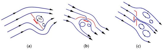 The following are the major observations during valve opening: (1) during the upstroke of the flapping wing, the horizontal free stream and the vertical downward airflow, due to flapping, are combined into a total incident velocity, which blows obliquely downward from the head top and it stops flowing in a purely vertical direction; (2) considering the inclined angle of the wing membrane during the upstroke, the inclined angle of the fuselage during the downstroke is no longer effective, but it is instead a nearly vertical pull-up movement. This can be also verified by high-speed photography. Combining the above two considerations (1) and (2), the position of the valve disc-cap is no longer facing back to the inlet airflow, but instead facing forward to the inlet airflow. The direction of the airflow through the valve in Figure 11b, on the contrary, flows from outside of the valve disc-cap into the central orifice as shown in Figure 11c. It is opened in accordance with the time of upstroke. In turn, this causes the leading-edge vortex (LEV) of the wing to be impacted and broken, reducing the lift value during the upstroke. The flow field is also changed in Figure 11c. An interesting observation is that it was originally thought that the lift of the upstroke should be negative, but the instantaneous angle of attack (AOA) of the wing, relative to the inlet airflow, was positive in Figure 11c. As the LEV intensity is reduced by the orifice jet, there is only a slight positive value. Due to this phenomenon, the lift during the upstroke shows a positive trend instead of a negative one, as shown in Figure 7(a2,b2,c2), which explains the first question.