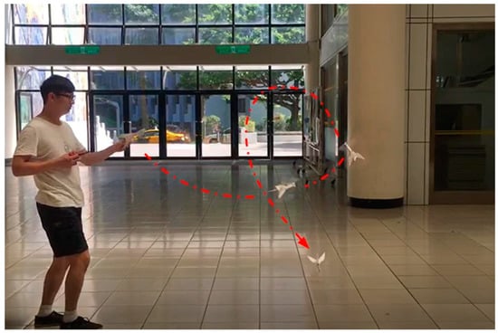 The real time flight testing was performed, which is shown in Figure 12. It was observed that the FWMAV with check-valves makes a sudden Immelmann turn after takeoff and generates a high lift value, which is considerably higher than the body weight of FWMAV. The experimental investigation results using this check-valve wing provides a good reference for the future design of FWMAVs maneuvering in two significant ways: (1) to allow for more payloads or batteries on the FWMAV; (2) to decrease the driving voltage as well as the required power, so as to prolong flight endurance.