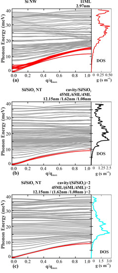 where summation is performed over all phonon modes s() with frequency . The phonon energy spectra and total DOS for Si NW and Si/SiO2 MNTs are shown in Figure 2. The Si NW has dimensions 11 ML × 11 ML (2.97 nm × 2.97 nm; 1 monolayer (ML) = 0.27 nm). The geometric parameters of the Si/SiO2 NTs are as follows: the cavity cross section is 45 ML × 45 ML (12.15 nm × 12.15 nm), the thickness of the Si layer is 6 ML (1.62 nm) and the thickness of the SiO2 layer is 4 ML (1.08 nm). Panel (a) represents results for the Si NW, panel (b)–for the NT with a single Si/SiO2 bilayer shell (N = 1) and panel (c)–for the NT with two Si/SiO2 bilayer shells (N = 2). Similarly to rectangular nanowires [21,58], phonon modes in rectangular MNTs can be classified into four types according to the spatial symmetry of the displacement vector components: Dilatational, Flexural1, Flexural2 and Shear. For the Si NW, we show phonon branches with numbers s = 1–4, 11, 17, …, 47, 51, 76, …, 301, 320 for Shear polarization; s = 1–4, 11, 17, …, 47, 51, 76, …, 326, 342 for Dilatational polarization and s = 1–4, 11, 17, …, 47, 51, 76, …, 326, 331 for Flexural1 and Flexural2 polarizations. For the Si/SiO2 NT with N = 1, we present phonon branches with s = 1–5, 30, 55, 480, 500, 550, …, 1000, 1075, …, 1600, 1661 for Dilatational polarization; s = 1–5, 30, 55, 480, 500, 550, …, 1000, 1075, …, 1600, 1640 for Shear polarization and s = 1–5, 30, 55, 480, 500, 550, …, 1000, 1075, …, 1600, 1650 for Flexural1 and Flexural2 polarizations. For the Si/SiO2 NT with N = 2, the following phonon branches are depicted: s = 1–5, 80, 155, 230, 305, 380, 455, 500, 675, 850, …, 2950, 3000, 3100 …, 3900, 3920 for Dilatational polarization; s = 1–5, 80, 155, 230, 305, 380, 455, 500, 675, 850, …, 2950, 3000, 3100 …, 3800, 3880 for Shear polarization and s = 1–5, 80, 155, 230, 305, 380, 455, 500, 675, 850, …, 2950, 3000, 3100, …, 3900 for Flexural1 and Flexural2 polarizations.