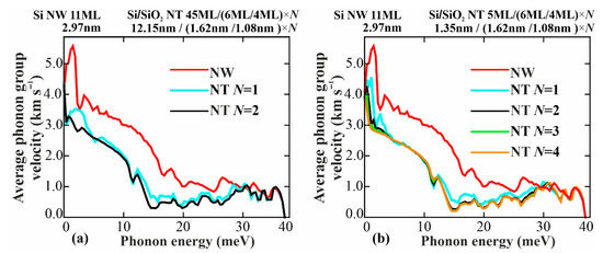 The effect of phonon deceleration in MNTs with different numbers of Si/SiO2 bilayer shells (N = 1, 2, 3, 4) is illustrated in Figure 3, where the average phonon group velocity is shown as a function of the phonon energy for a Si NW with cross section and different Si/SiO2 NTs with the following geometrical parameters: , (panel (a)) and (panel (b)). The phonon group velocity in NTs is smaller than that in a NW over a wide energy range (0 to 30 meV). The reduction of the phonon group velocities in NTs is explained by an acoustic mismatch between Si and SiO2, a stronger phonon confinement and a spectral redistribution of the phonon DOS in NTs. In the energy range from 30 to 37 meV, the phonon group velocities vary near the same low values for all considered NTs. Increase of the number of shells slightly reinforces the drop of phonon group velocity.