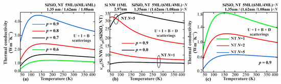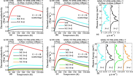 A comparison of temperature dependencies of thermal conductivity (TC) in a Si NW and Si/SiO2 MNTs is provided in Figure 4. The geometrical parameters of a NW and MNTs are the same as in Figure 3. The thermal conductivity curves presented in panels (b) and (e) are calculated considering diffusion transport in SiO2 (see Equation (7)), while those in panels (a) and (d) consider boundary scattering (see Equation (8)) with the specularity parameter p = 0.6. The values of the thermal conductivity in the NTs (even for the NTs with a greater number of phonon modes) are lower than the thermal conductivity in the NW in the whole temperature range. This decrease of TC in the MNTs is due to modification of phonon energy spectra in MNTs leading to phonon deceleration, as well as enhancement of the phonon scattering at interfaces and diffusion of vibrational excitations in SiO2 layers.