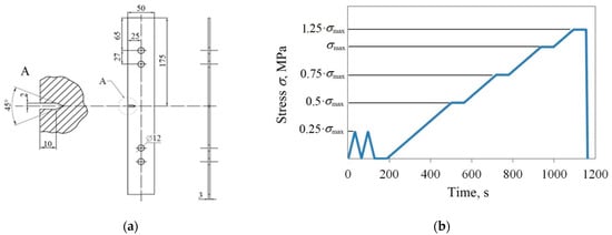 A fatigue crack was grown on each specimen by cyclic tensile loading using the pulsation cycle (cycle asymmetry coefficient Rc = 0) with a frequency of 5 Hz and a maximum cycle load of σmax ≈ 0.6·σy, where σy is a yield stress. The number of loading cycles was chosen so that the fatigue crack developing under cyclic loading in the lateral notch region would reach a certain length. Nominal crack lengths ranged from 3 to 15 mm. Thus, the total length of the notch and crack was approximately 15–28 mm depending on the specimen. After the crack growth, the specimens were tested under static tension using a loading scheme adopted during industrial AE testing (Figure 3b) [18]. A series of experiments was done for 10 specimens with identical parameters.