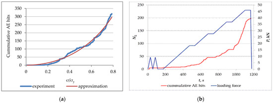 Cumulative acoustic emission (AE) hits NΣ relations: (a) cumulative AE hits NΣ vs. current stress σ/σy and its Palmer–Heald approximation; (b) cumulative AE hits NΣ and loading force P vs. time t.