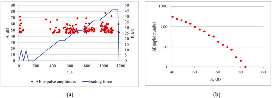 Amplitudes of AE impulses: (a) AE impulse amplitudes A and loading force P vs. time t; (b) AE impulse amplitudes distribution.