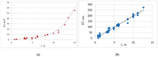 Dependence of AE parameters versus propagation distance L: (a) rise angle (RA) vs. distance L, (b) rise time (RT) vs. distance L.