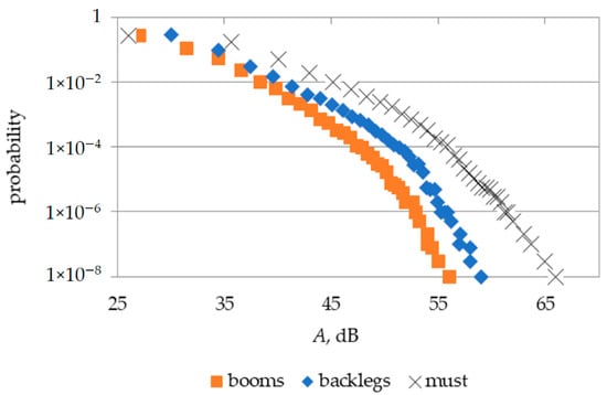 The main source of acoustic noise measured during the AE testing of walking dragline excavator is friction and vibration generated by the movement of the hoist ropes and dragropes that control the bucket position. The noise has a stochastic non-stationary nature, its intensity turned out to be different for AE sensors installed on various dragline constructive parts. The lower the noise intensity, the greater is the distance of the structural component from the moving ropes. Figure 8 shows the empirical probability function of the noise long-time realization measured with a different sensor located on the structural components above and below the boom, and on the side frame—back legs and a mast. The highest noise level was observed along the measuring channel installed in the lower part of the mast near the dragropes, while the lowest level was detected along the channels installed on the lower part of the boom. It can be explained by the fact that they are placed far away from the trajectory of the ropes.