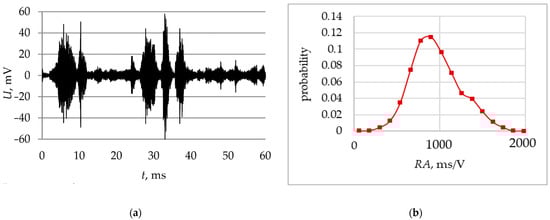 It can be inferred from Figure 8 that there is a high level of noise with a standard deviation of 40–45 dB. The maximum values typical for a set of 108 samples (that correspond to 100 s with a sampling frequency equal to 1 MHz) are 50–65 dB. The noise is non-stationary because it is caused by the uneven movement of the ropes in different phases of the dragline operation cycle. For instance, when the bucket is loaded, the dragrope is pulled. When there is a stage of unloading, both the dragrope and hoist rope are weakened and moved. When the platform turns, no movement of the ropes is visible, and the intensity of noise is dramatically reduced. Figure 9a presents the longtime noise waveform; its peak corresponds to 68 dB, and in the low-intensity phase ~ 40–45 dB. A favorable factor is that the impulse noise components differ from the AE signal impulses by greater values of the RT and RA parameters. Figure 9b shows the empirical distribution of the RA parameter corresponding to noise impulse components. The distribution mode equaled the value RA = 900 ms/V, which is significantly higher than the values of the RA parameter for AE impulses emitted by a defect.