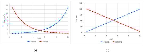 Parametrical model of AE impulse: (a) RA depending on the coordinate of AE source, (b) RT depending on the coordinate of AE source.