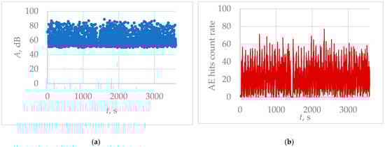 AE data measured during structural health monitoring of walking dragline excavator: (a) amplitudes of AE impulses in a period of an hour, (b) AE hits count rate in a period of an hour.