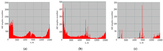 Parametric filtering turned out to be the most considerable approach to noise disposal. The result of its application is represented in Figure 13c. The number of localized AE events decreased to 1517, while both uniform background noise and false clusters at the location diagram edges were removed from the diagram. However, the number of events that in the location cluster in the area of x ≈ 8800 mm did not change.