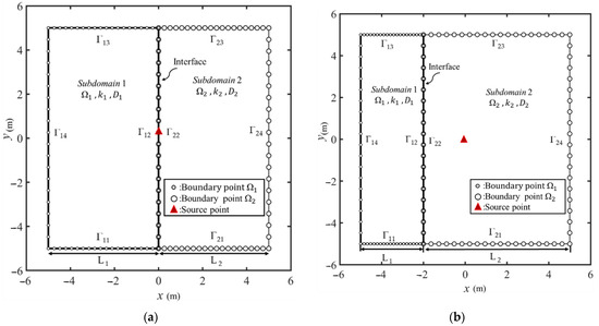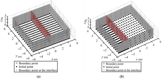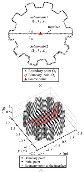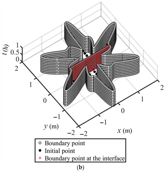 where is the hydraulic diffusivity of the ith subdomain. The hydraulic diffusivity and hydraulic conductivity in two subdomains were set to be and , and and . The final elapsed time is 1 h. The boundary points are collocated on the boundary, as illustrated in Figure 1b. For simulating transient flows in two-layered porous media, DDM is utilized [35]. The domain boundary can be divided into several subdomains.
