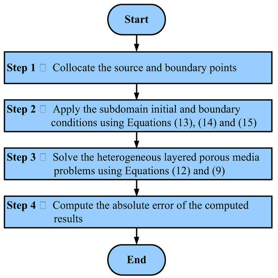 A variety of mesh-generated techniques, such as the boundary element method [13], finite element method [14,15], finite volume method [16,17], and finite difference method [18,19], have been proposed to analyze heterogeneous layered porous media. In contrast with conventional mesh-generated techniques, meshfree approaches have attracted much attention in recent years because of their characteristics of simplicity, meshfree, and the capability to deal with engineering problems with complex geometry [20,21,22,23,24,25,26]. Of the wide variety of meshfree approaches, the Trefftz method is one of the widespread boundary-type meshless methods for dealing with steady-state Laplace-type problems, where computed results are approximated as a series of basis functions, completely satisfying the governing Laplace-type equations [27,28,29].