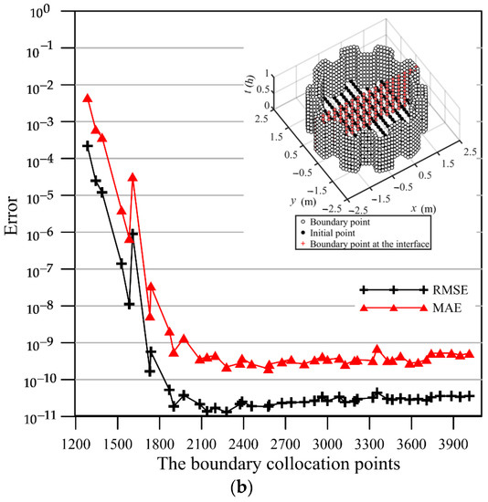 where is the exact solution, is the approximate solution, RMSE denotes the root mean square error, MAE denotes the maximum absolute error, and is the number of scattered inner points. Here, the scattered inner points were uniformly distributed in the space–time domain.