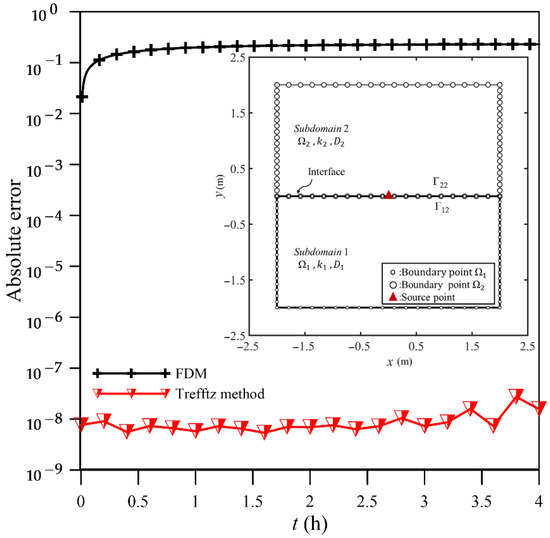 In this example, the hydraulic diffusivity and hydraulic conductivity in the two subdomains were set to be and , and and . The final elapsed time is 4 h. The order of the basis functions is 16. There are 2600 boundary points for this domain.
