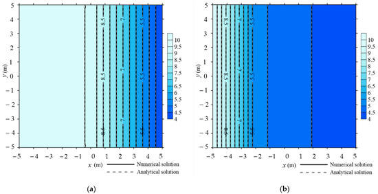 The profiles of total head at the final time were selected to express the approximations, as shown in Figure 10. The approximations at the final time from our approach were further compared with the steady-state solution. It is found that the approximations utilizing our approach may agree well with the steady-state solutions. The absolute difference at the final time is depicted in Figure 11. The absolute difference for case I and case II is in the order of 10−6 and 10−4, as given in Figure 11. Results demonstrate that our approach may obtain reasonable results for modeling transient flows in two-layered porous media.
