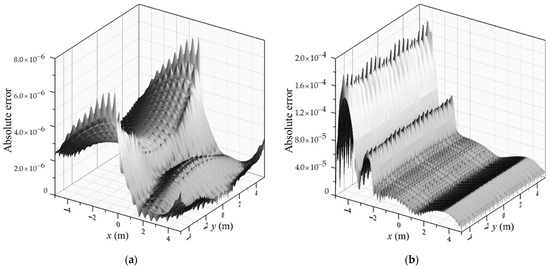 Figure 3a shows the error versus the order of the basis functions. It appears that approximations with a high accuracy are acquired then the order is superior to 14. Additionally, promising results may be obtained when the order of the basis function ranges from 14 to 26. It seems that the optimal order may depend on the nature of the problems. The relationship between the absoluter error and the number of boundary points is displayed in Figure 3b. The results obtained illustrate that approximations with a high accuracy are achieved when the number of boundary points is greater than 1800. From the results of this convergence analysis, the number of the boundary points and the order of the basis functions were determined to be 2000 and 15, respectively.