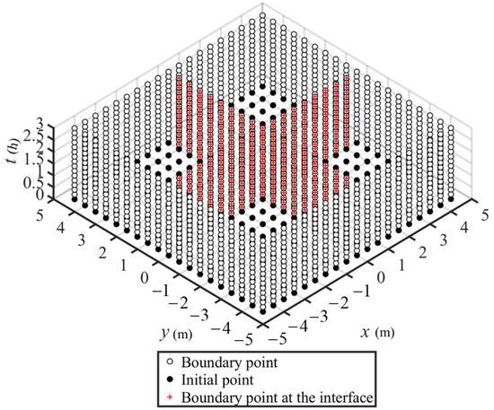 In this example, the hydraulic diffusivity and hydraulic conductivity in the two subdomains were set to be and , and and . The final elapsed time is 1 h. The order of the basis functions is 17. There are 2026 boundary points for this domain. This example involves two-dimensional space and one-dimensional time. The space–time domain is therefore transformed into a three-dimensional object domain, as shown in Figure 4b. The boundary points are placed on the boundary, as illustrated in Figure 4b. For simulating transient flows in two–layered porous media, DDM is utilized [35]. The domain boundary can then be split into two subdomains. The Dirichlet boundary conditions are prescribed based on Equations (27) and (28). Based on Equation (11), the sub-boundaries at the interface, including and , must satisfy the continuity of flows and the flux conservation.