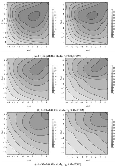 This example was solved using both the finite difference method (FDM) and the proposed method. For the FDM analysis, the spatial and temporal discretizations for the problem must be considered separately. The central difference approximation was adopted for the spatial discretization, and the implicit scheme was adopted for time discretization. For FDM, we considered each length of Δx along the x axis, each length of Δy along the y axis, and each length of Δt along the t axis to be 0.1 m, 0.1 m, and 0.001 h, respectively. We then compared the approximations of our method with those of the FDM.