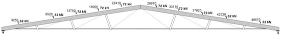 Normally, permanent and variable loads are combined independently, but in the authors’ opinion, the loads should be combined dependently, as the independent combination contradicts the physics [20]. The dependent combination results in higher loads, and is therefore safer and applied here. As a comparison, the results for the independent load combination are given as well. The authors explained the dependent and the independent safety factor calculation procedure earlier [18,19], and it is disclosed concisely here.