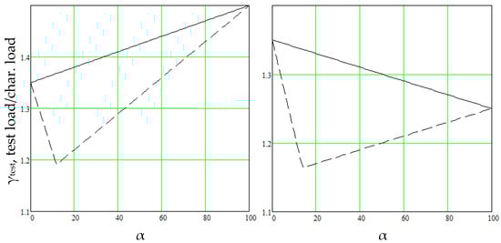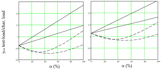 The load factor γL and the test load γtest as a function of the load ratio α; i.e., a 15% lower factor than used in the Eurocodes. The left and right graphs apply to (e.g., snow), and (e.g., live load), respectively. Solid lines correspond to Equation (1), and dashed lines to Equation (2).